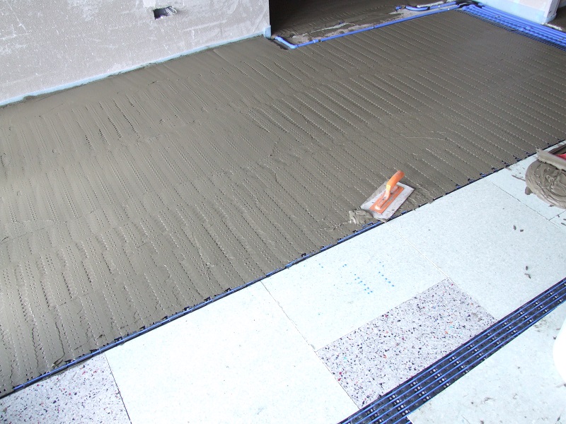 Direkt auf den Unterlagsboden – extra dünn. Danach Plattenarbeiten und Heizanschlüsse.