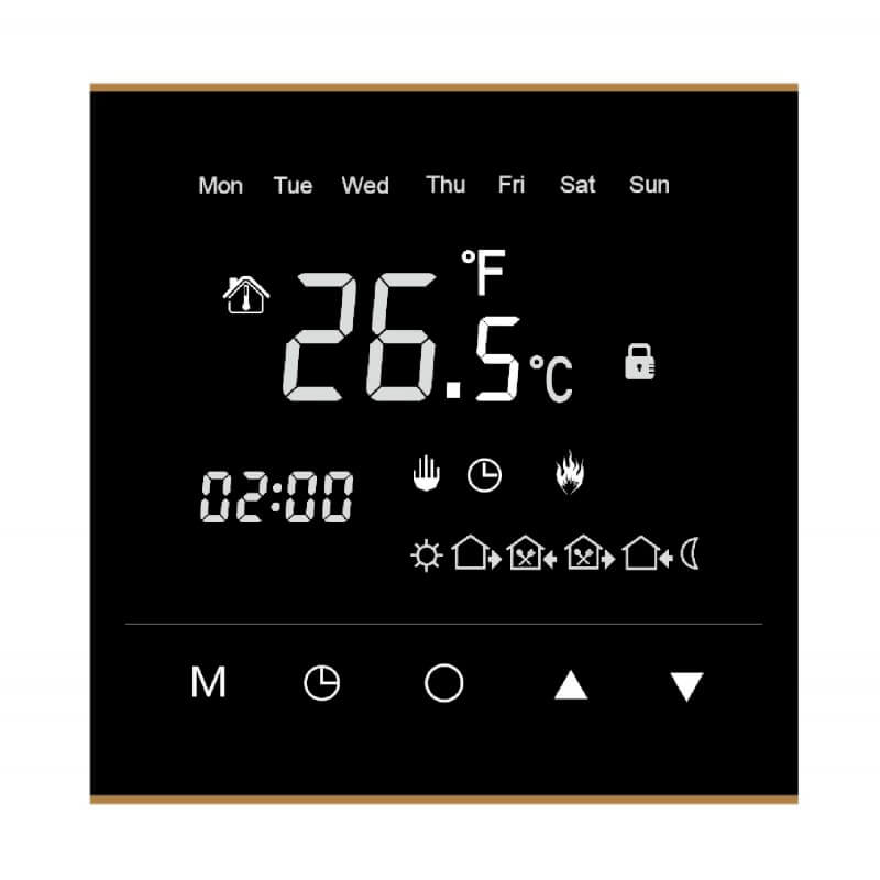 Das übersichtliche LCD Display mit Touch Screen ermöglicht eine einfache Erstellung des Wochenprogramms. Der Sollwert ist im Tag- und Nachtbetrieb zwischen 5 °C und 35 °C einstellbar und kann zusätzlich im Tagesprogramm in 6 verschiedene Zeitzonen unterteilt werden. Der Regler ist werkseitig mit einem Standard-Wochenprogramm voreingestellt.