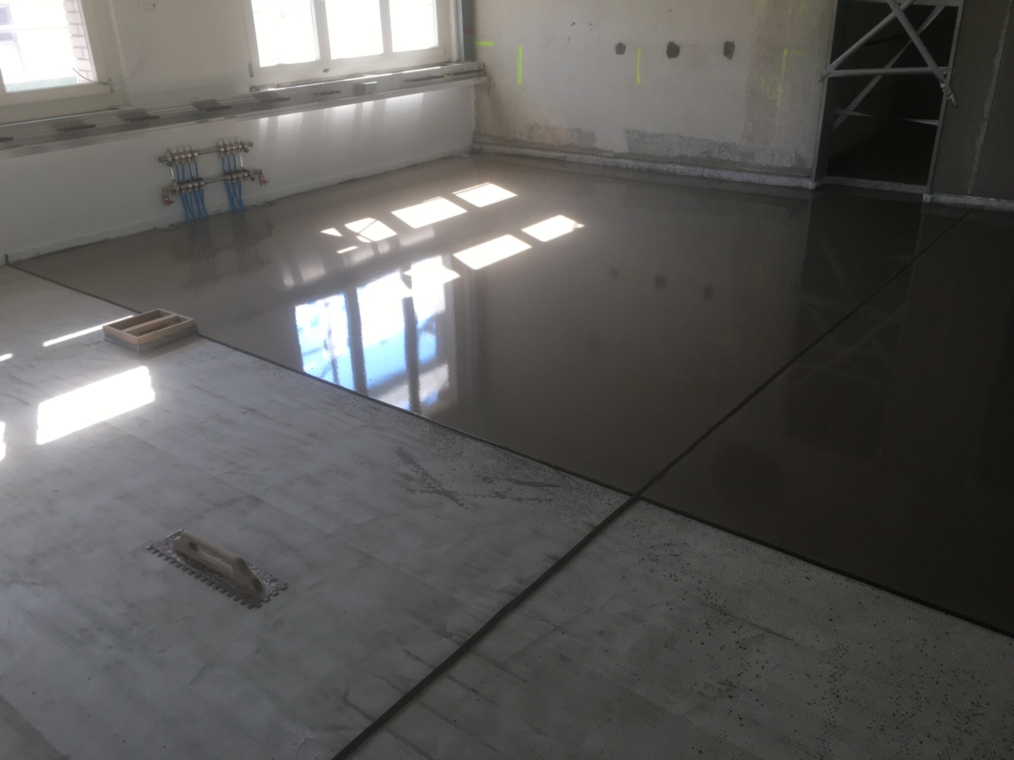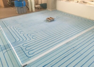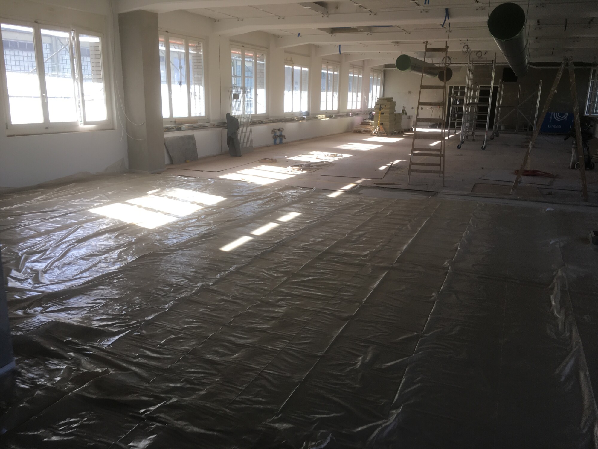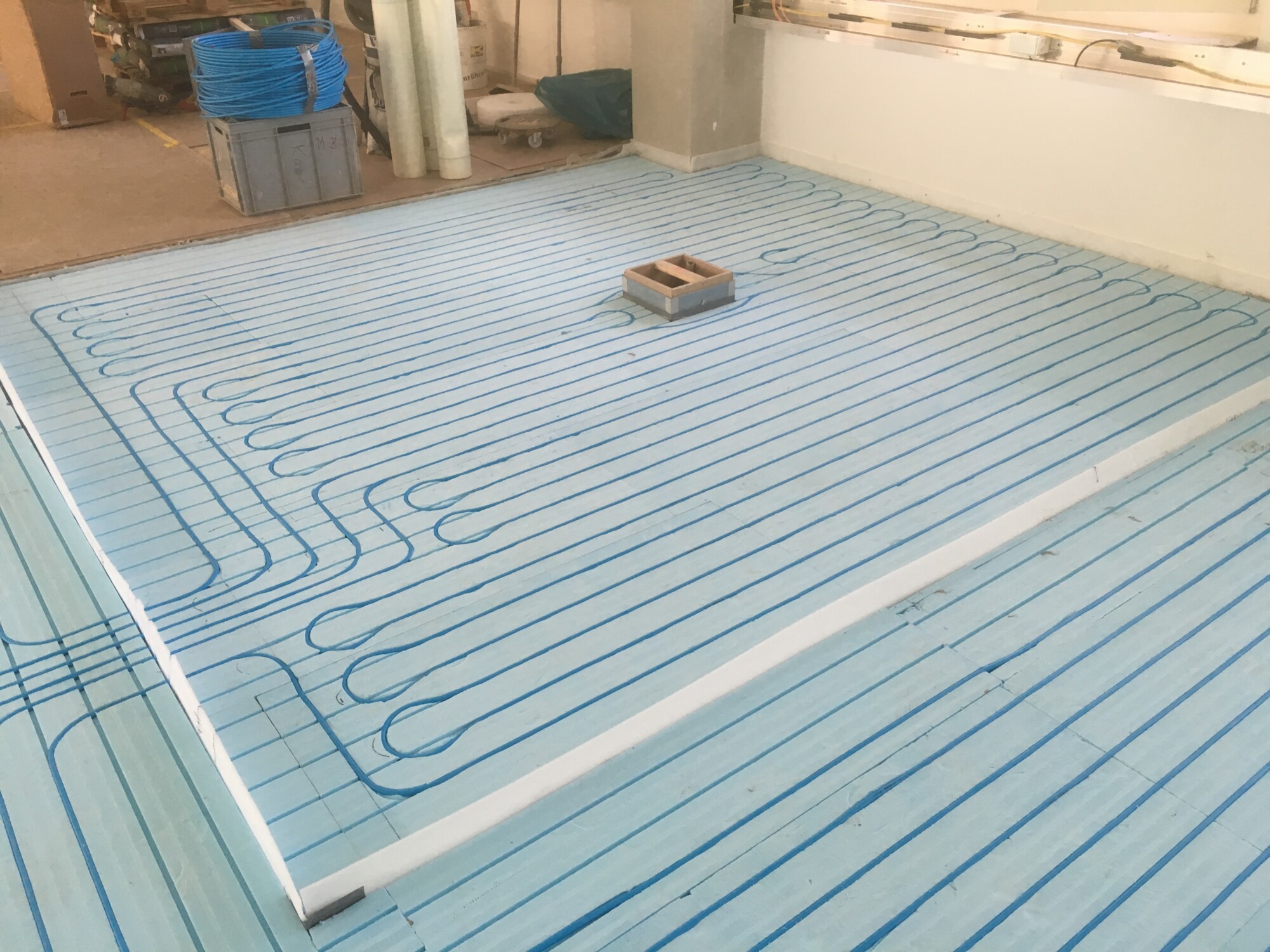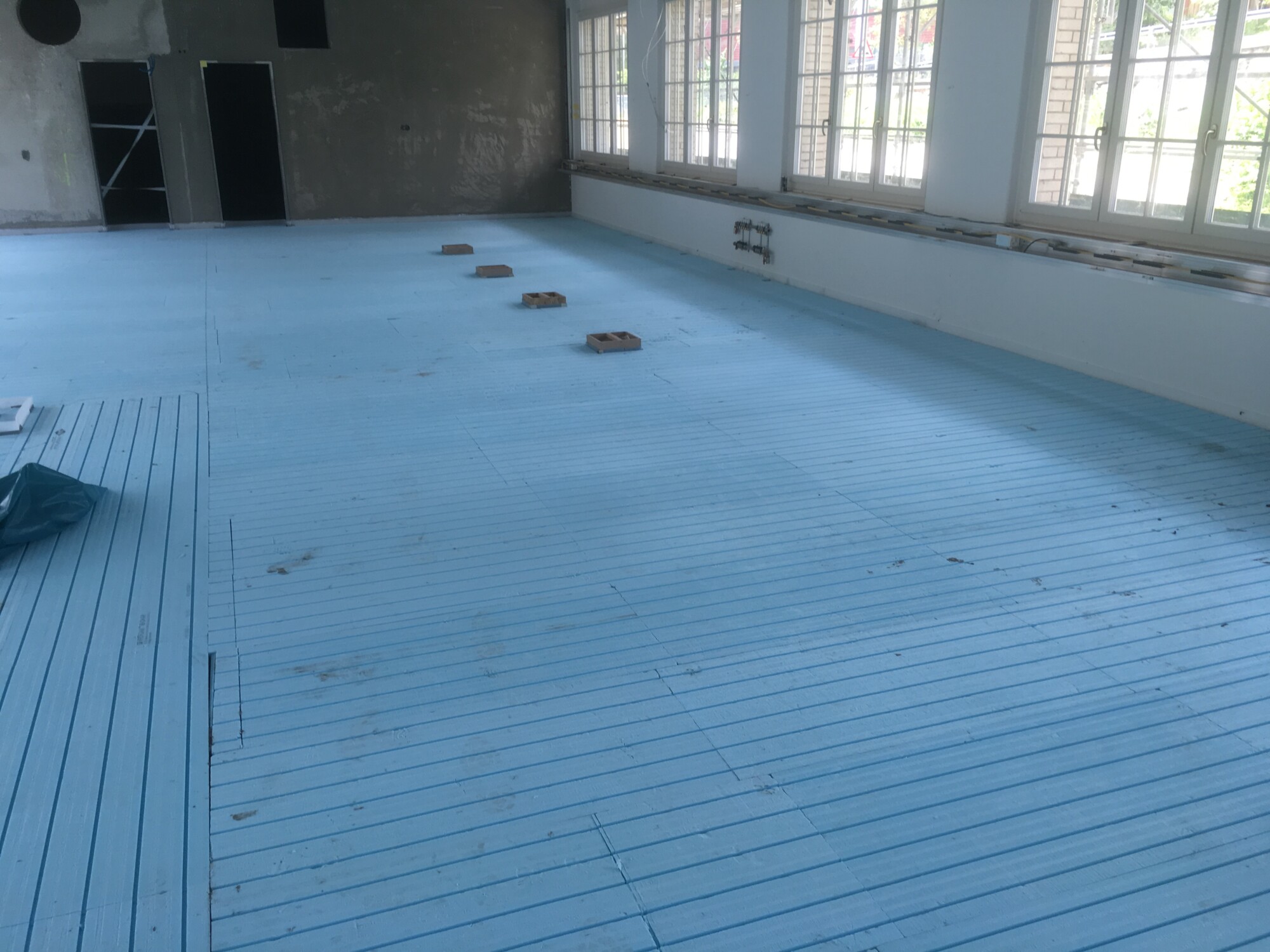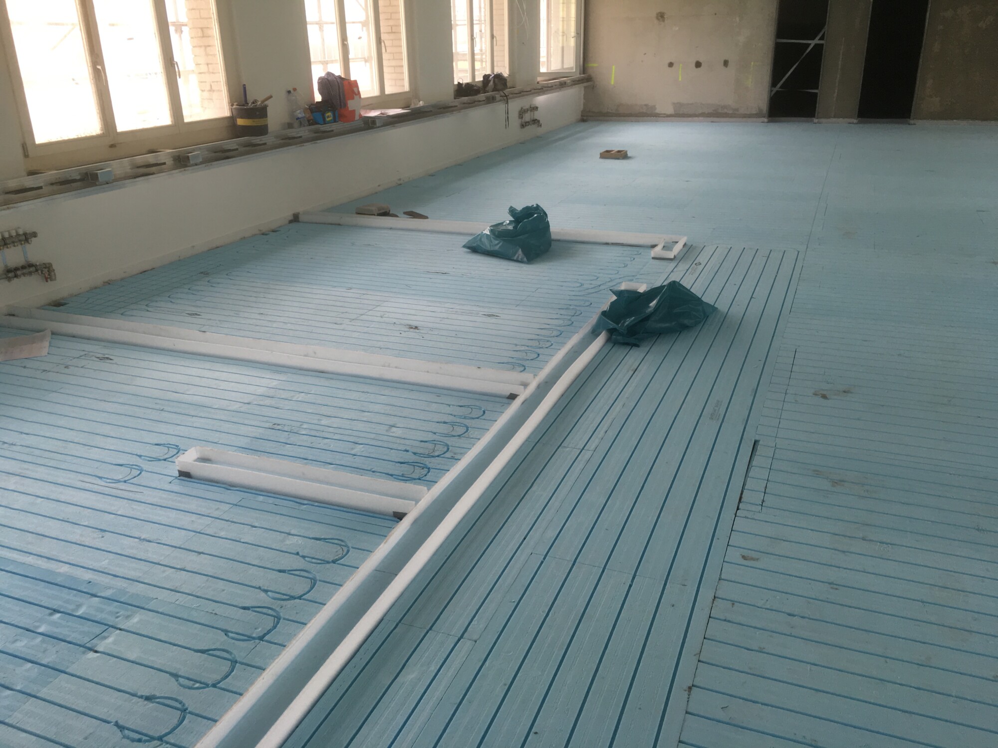 Die grossflächige Bodenheizungsinstallation über 600 Quadratmeter musste in Etappen abgewickelt werden. Zudem wurde ein hoher Isolationswert gefordert, welchen wir mit einem mehrschichtigen System bewerkstelligen konnten.